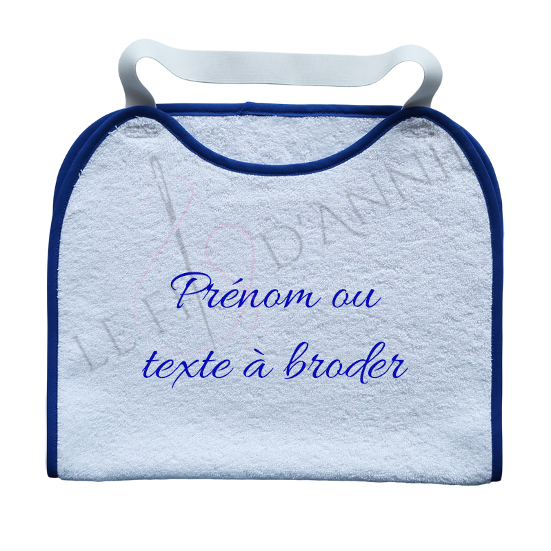 Personnalisez votre bavoir en choisissant : la couleur de l’éponge, de l’élastique, du biais pour le tour du bavoir, le modèle d’écriture et la couleur du fil pour la broderie.